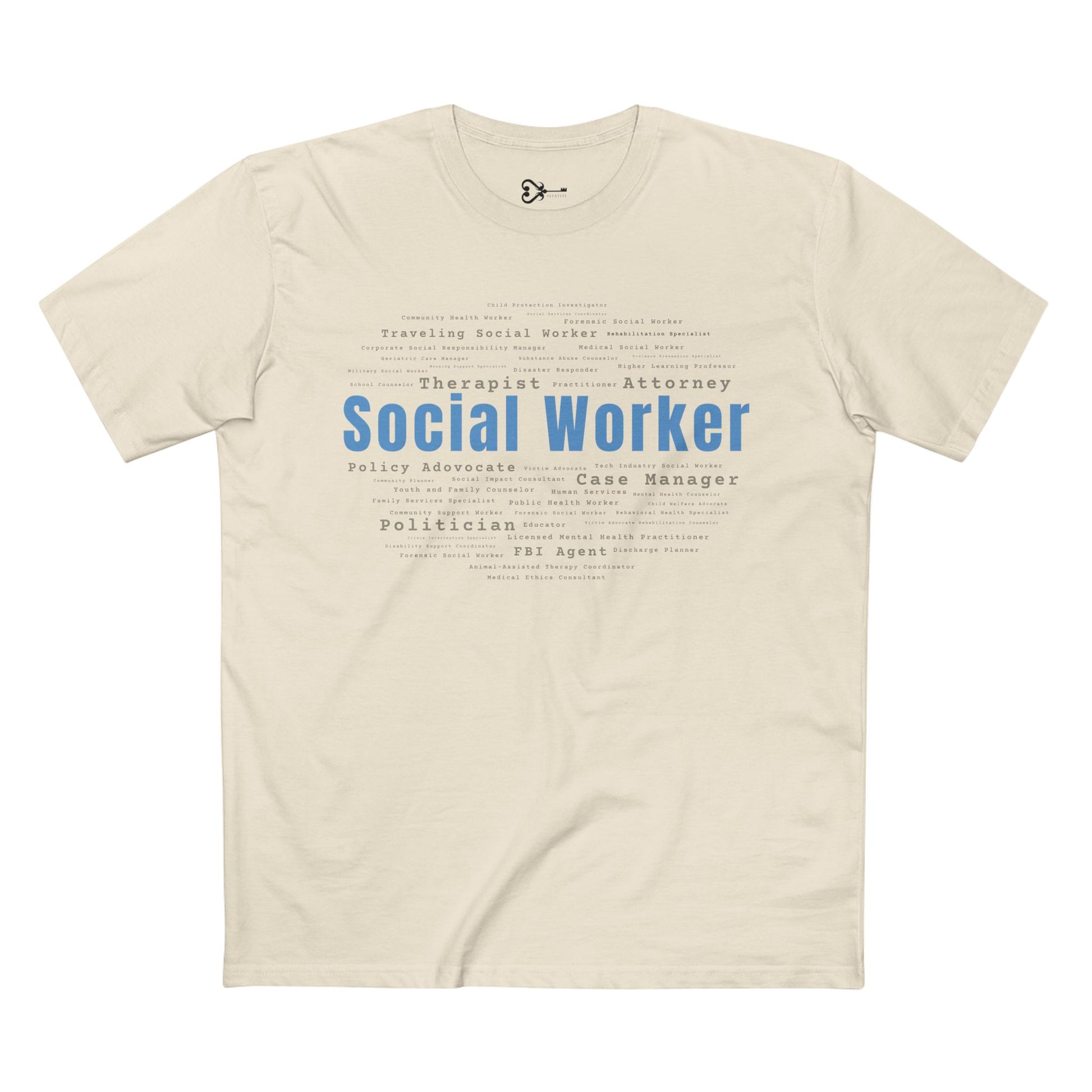 Social Work Cloud Tee serves as a tribute to the diverse and impactful roles within the field of social work. This comfy and casual T-shirt features a fitted, snug crew neck designed for breathability and ease of layering, making it perfect for active or leisure wear. Preshrunk to reduce shrinkage. Available in classic color schemes: white, black, and natural.